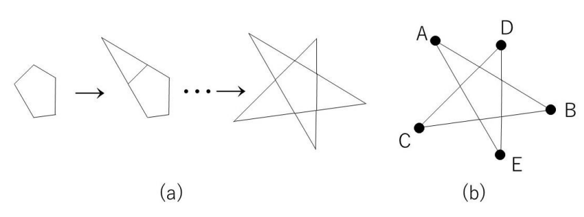 ただし、星型5角形とは、隣り合う頂点の内角の和が180度より大きくなる凸5角形において、各辺を片側に延長した際、交わる点どうしを直線で結んで描かれる図形である。このようにして、凸5角形から星型5角形を作る様子の例を図(a)に示す。図(b)に示すように、この星型5角形は点A,B,C,D,EをA→B→C→D→E→Aの順に結ぶことで描ける。