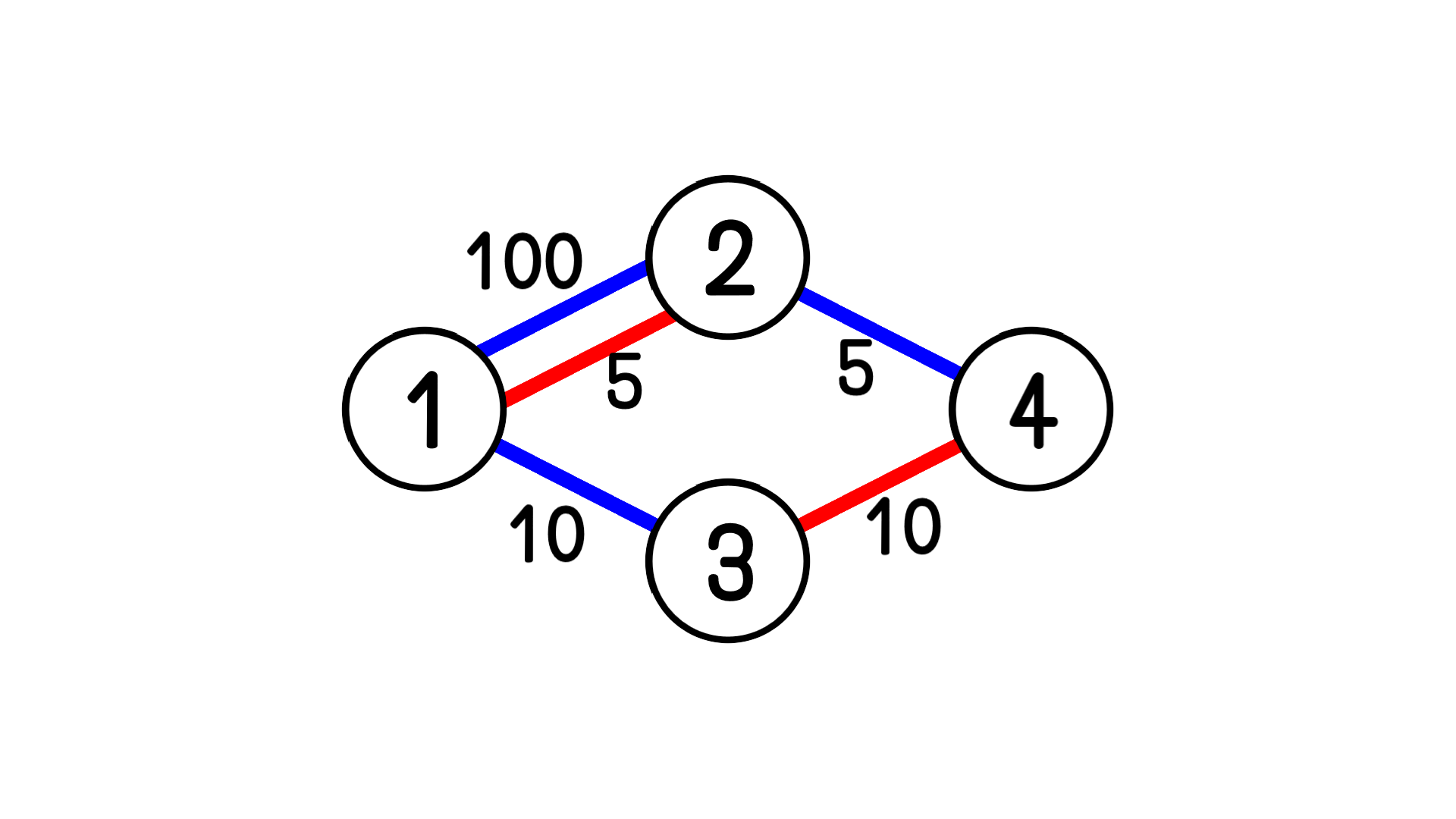 赤線が交通会社$1$、青線が交通会社$2$によって管理されているマシュルートカである。