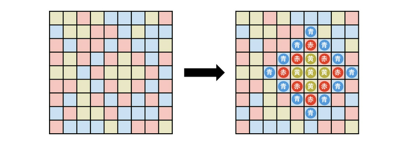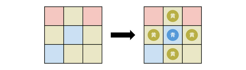 r = 1,(x, y) = (2, 2) とし,c0 として青,c1 として黄を選ぶと,下図のように 5 本の花を植えることができる.ただし,背景色は各区画に植えることができる花の色を示している.