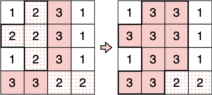 マス (i,j) から辺で接しているマスへの移動を繰り返し,マス (i,j) と色が異なるマスに入ることなく移動できるマスの集まりを,ここではマス (i,j) の領域と呼ぶ.